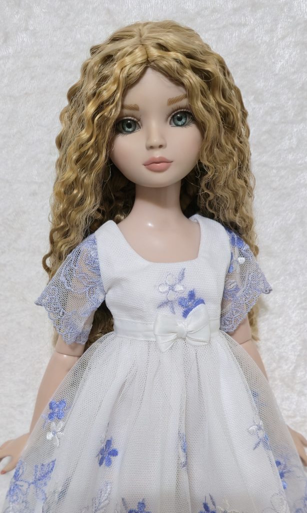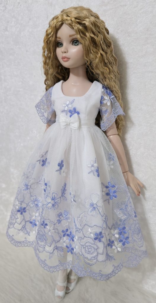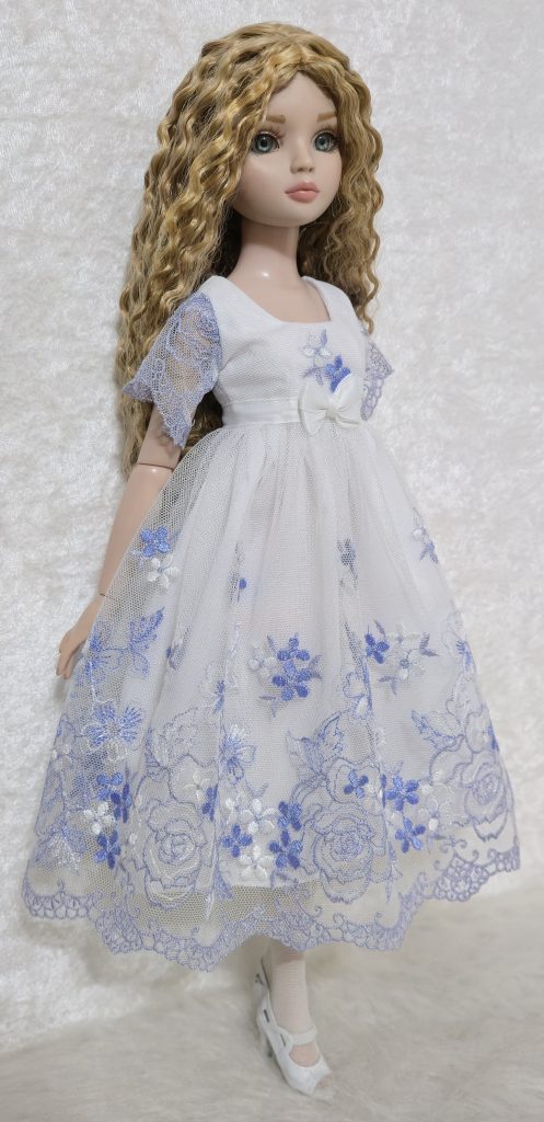 This gorgeous dress is done in a white french lace with blue and white rose floral embroidery. The dress is fully lined in a white cotton fabric, and below the knee length. The waist is adorned with a white satin ribbon and bow. This dress closes in the back with two snap closures. Doll, stockings, and shoes are not included.
