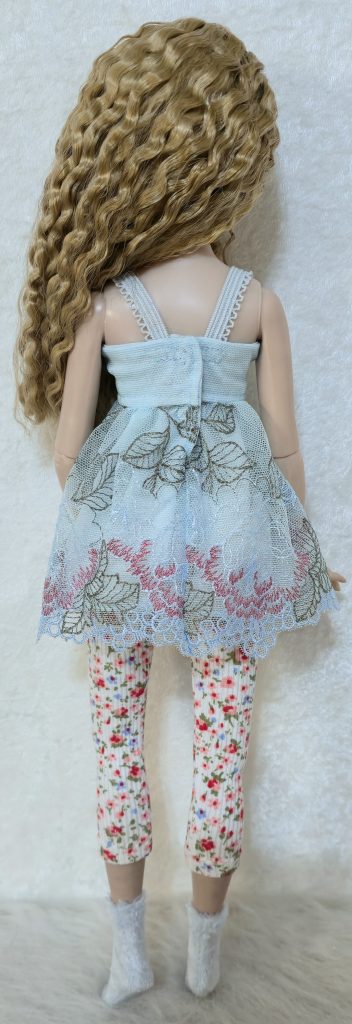 This sweet set includes the pale blue lace top with floral embroidery, fully lined in a pale blue cotton fabric. The front is adorned with a pale blue satin ribbon bow and closes in the back with two snap closures. White floral cropped jersey knit leggings, with an elastic waistband, and pale blue velvet socks. Doll, and shoes are not included.