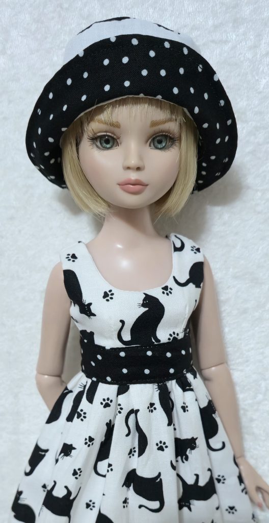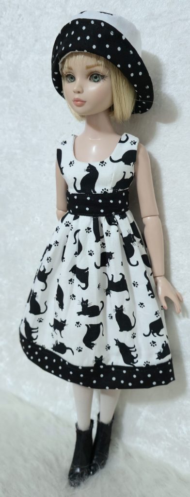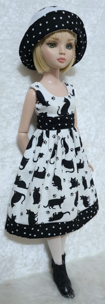 Black Cat print dress and hat for the Tonner Ellowyne girls. Dress is fully lined in a white cotton fabric, below the knee length and closes in the back with two snap closures. Also included is the black and white matching hat. Doll, stockings, and shoes are not included.